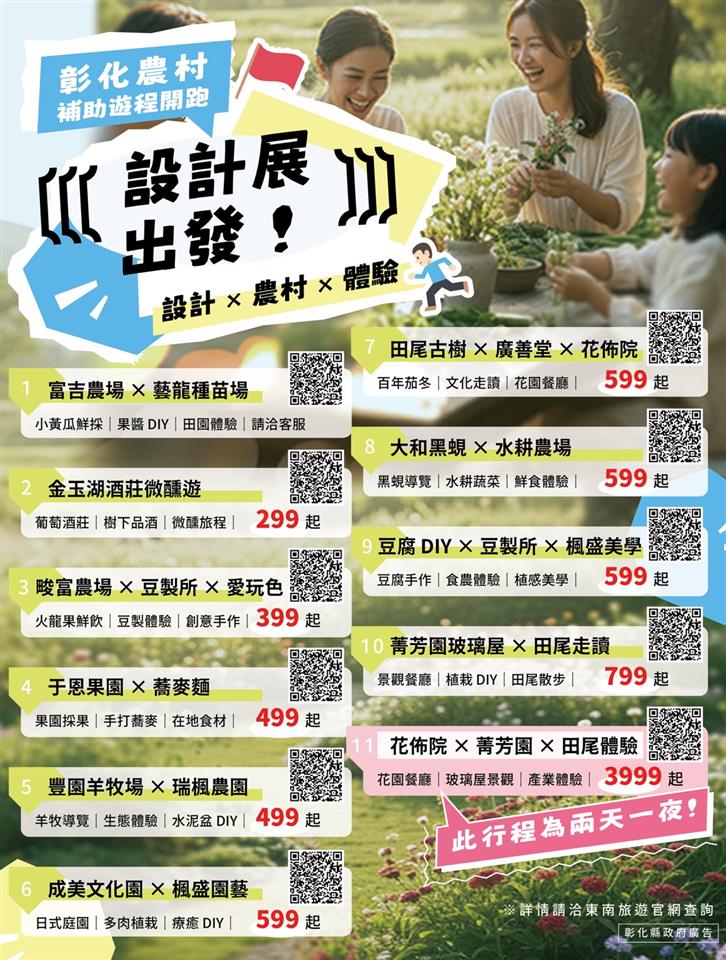 新聞焦點 串聯台灣設計展在彰化 輔導農遊品牌 推出特色農遊行程 發布日期 2025/09/25~2025/10/25 | 發佈單位: 農業處 | 發佈日期: 陳科長 7531661分機1661 | 更新日期 2025/09/25 | 瀏覽人數: 40人 《置頂》 彰化縣政府推動的「2025農村旅遊風土提案所」休閒農業輔導計畫,今(25)日於縣府中庭展示成果,彰化縣長王惠美親自頒發金、銀、銅牌及優選獎,農業部農村發展及水土保持署南投分署副分署長陳存凱、農業部農村發展及水土保持署科長廖麗蘭與民代等人與會,王縣長表示,「彰化很有料,只是我們過去太低調」,感謝農業部農村發展及水土保持署長期輔導彰化縣休閒農業,感謝議長謝典林及議員們對預算的支持,還有各休閒農業區及農場,以及所有旅遊通路夥伴,一起為彰化農業觀光打拚。縣府結合農業、文化、旅遊,打造屬於彰化的農遊品牌,今年與中央一起輔導有5組獲獎團隊,推出11條農遊行程,串聯旅行業與2025台灣設計展,上架至擁有60萬會員的東南旅行社,遊程結合即將登場的「2025 台灣設計展」,讓到訪彰化的朋友,不只看展覽,還能走入田野,感受彰化獨特的風土民情。 王縣長表示,「2025 農村旅遊風土提案所」休閒農業輔導計畫,這次表揚5組團隊以創新思維深化「從產地到體驗」的服務設計,將「農業力」轉為「旅遊力」,推出的11條農遊產品化與上架旅遊通路,以「內容升級、通路連結、數位導流」打造可持續、可擴充、可複製的體系,讓「農業力、旅遊力、學習力」成為彰化風土的代名詞。 王縣長指出,這次計畫共辦理8場次,24小時培力課程,有100位業者一起共學,吸引17組團隊、近100家業者參與遊程競賽,最後有5條特色路線脫穎而出。榮獲金獎的「田間旅遊RPG|百大青農的邀請函」,展現青農創新與在地田野的深度結合;銀獎「農業1+1:土地共學 × 綠色共創」,呈現農業共學與環境永續的價值;銅獎「巡田計畫-田尾的循環美學旅」,把循環農業與地方美學巧妙串聯;優選的「斗苑微醺採果小旅行」與「食在風土,學在沿海:彰化海線風味教室」,則以輕旅行和文化風味展現農村體驗的多元樣貌。這些遊程蘊含農村的智慧與創意,從農場到餐桌,讓在地文化融入旅程體驗。 農業部農村發展及水土保持署南投分署副分署長陳存凱表示,這幾年彰化農村進步很多,身為彰化人,感到非常驕傲,後續將持續支持彰化的農村發展工作。 農業部農村發展及水土保持署科長廖麗蘭表示,王縣長提到彰化有許多休閒農業區,就像一顆顆珍珠般閃閃發亮,縣府透過遊程競賽,成功將這些珍珠串成一條線,未來將逐步擴大,形成「區域農遊」,結合旅行業者一起協助當地農遊業者行銷全國。 立委謝衣鳯表示,彰化縣政府在王縣長的帶領下,結合農村水保署及臺灣設計展的理念,提出非常好的遊程提案,希望藉由這次的台灣設計展可以帶動更多世界的遊客到訪彰化,共同來體會彰化的美好。 與會貴賓有立法委員謝衣鳯、縣議員陳玉姬、縣議員林宗翰服務團隊、農業部農村發展及水土保持署南投分署副分署長陳存凱、農業部農村發展及水土保持署科長廖麗蘭、格斯旅行社總經理李明效、山富國際旅行社經理蔡亦倫、五福旅遊經理賴素芬、彰化旅行社經理莊碧惠、勝景旅行社總經理陳麗英、東山旅遊副理黃曉豪、可樂旅遊旅行社協理蔡麗雪、永達旅遊總經理特助林詩菁、億貿旅行社業務林碧筠、縣府農業處長郭至善、各獲獎者、各級民代與地方仕紳等。 11條農遊行程: 1.富吉農場涼拌鮮採小黃瓜、藝龍種苗場果醬創意DIY 2.金玉湖葡萄酒莊、葡萄樹下品酒、微醺小旅行 3.畯富農場鮮飲火龍果、導讀豆製專門店、愛玩色創意館 4.二林于恩果園採果體驗、日式手打蕎麥麵體驗 5.豐園羊牧場生態導覽、瑞楓農園手作水泥盆植物組合體驗 6.台版兼六園成美文化園、楓盛園藝療癒多肉植物上板DIY 7.走讀田尾百年茄冬樹、廣善堂、花園地景花佈院餐廳 8.深入大和黑蜆基地、新鮮生菜番挖水耕農場 9.田野勤學食農豆腐DIY、導讀豆製專門店、植感楓盛美學 10.湖畔玻璃屋菁芳園景觀餐廳+小品組盆DIY、走讀田尾 11.花園地景花佈院、湖畔玻璃屋菁芳園、走讀田尾、產業體驗 遊程連結:https://www.settour.com.tw/act/mkt/allowance/index.html 「飲酒過量,有礙健康」