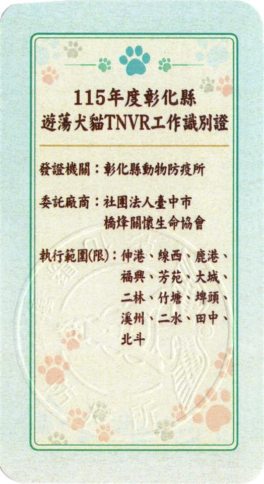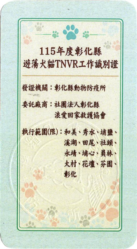 新聞焦點 為控管遊蕩犬貓數量 打造友善動物之城市 彰化縣115年度遊蕩犬貓TNVR活動正式啟動 發布日期 2026/01/18~2026/02/18 | 發佈單位: 農業處 | 發佈日期: 賴技佐 分機04-7620774#262 | 更新日期 2026/01/13 | 瀏覽人數: 4人 國內流浪動物零撲殺政策於106年2月6日正式上路,在收容空間有限的條件下,為控管遊蕩動物數量及維護動物福利,打造動物友善城市,彰化縣政府今(115)年度持續加強辦理遊蕩犬貓TNVR(即捕捉、絕育、注射狂犬病疫苗及回置)工作,希藉由加強本縣遊蕩犬貓之絕育工作,能有效減少彰化縣轄內遊蕩動物數量,降低人與遊蕩動物之間的衝突,以保障動物福利及民眾人身安全。 自108年1月1日起至114年12月31日止,本縣共計完成遊蕩犬貓TNVR絕育工作計13,967隻,今(115)年度委託2家廠商持續加強辦理遊蕩犬貓TNVR工作,歡迎有意協助本縣遊蕩犬貓絕育工作之縣民上網報名參加,名額有限,額滿為止,本計畫係委託彰化縣浪愛回家救護協會及臺中市橋烽關懷生命協會辦理,為利本縣縣民有效辨識,本承攬廠商人員於現場執行作業時,均配戴加蓋本所鋼印之識別證(如下圖所示)。 本計畫係委託承攬廠商辦理,報名案件將由承攬單位依表單內容審核是否符合受理條件,請報名民眾於完成登記後務必保持電話暢通,以利承攬廠商後續聯繫安排。 網路預約如下: 第一區-臺中市橋烽關懷生命協會 (伸港+線西+鹿港+福興+芳苑+大城+二林+竹塘+埤頭+溪州+二水+田中+北斗) https://forms.gle/agdyhFVD93uQPpoG6 第二區-彰化縣浪愛回家救護協會 (和美+秀水+埔鹽+溪湖+田尾+社頭+永靖+埔心+員林+大村+花壇+芬園+彰化) https://forms.gle/yn8iyb6oRec8FM928