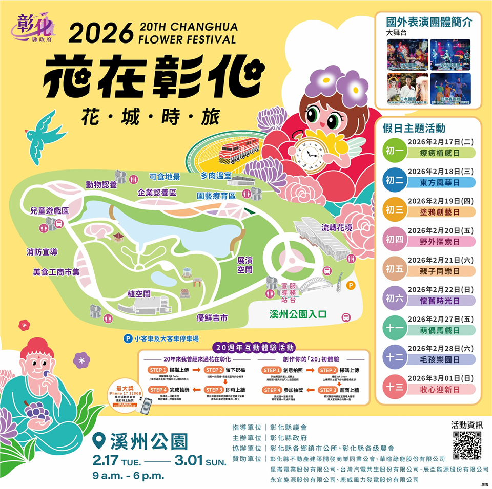 新聞焦點 「花在彰化」邁入20週年!王惠美縣長邀請全國鄉親春節踏上「花城時旅」 發布日期 2026/02/03~2026/03/03 | 發佈單位: 農業處行銷企劃科 | 發佈日期: 陳科長 7531661 | 更新日期 2026/02/03 | 瀏覽人數: 9人 《置頂》 全台春節走春第一品牌「花在彰化」迎來20週年里程碑!彰化縣政府今(3)日於縣府中庭舉辦記者會,縣長王惠美宣布 2026「花在彰化」以「花城時旅」為主題,從大年初一(2月17日)至正月十三(3月1日)在溪州公園盛大登場。王縣長表示,今年花在彰化有三大亮點,一是繽紛的花卉饗宴,以「花城時旅」為活動主題,融合生活花藝、永續概念與沉浸式體驗;二是精彩的9大假日主題活動,從親子同樂到毛孩樂園、國際團隊演出及特色市集,推出「滿額送」及「兩倍券」促銷;三是「20週年主題互動體驗」,上傳精彩回憶,即時呈現電視牆、列印紀念照,還可抽 iPhone 17 與農特產好禮!邀請全國民眾「回娘家」,見證彰化花卉產業的轉型與美學。 王縣長表示,20年來「花在彰化」從一場地方賞花活動走到今天,已經成為全台走春第一品牌,更是許多家庭每年新春的幸福記憶。2026年以「花城時旅」為主題,將20年的情感、記憶與想像融入其中,整合主題花展、生活花藝、多元展演、特色市集、園藝療育、可食地景、多肉溫室、食農教育與動物認養,打造結合文化、觀光、產業與生活美學的花卉盛會。讓走春不只是賞花,更是一趟能仔細品味的深度之旅。 王縣長指出,今年的展館處處皆驚喜,將彰化豐富的園藝產業提升至生活美學層次,「流轉花境」主展館分為五大主題區,從「花啟時分」跨越到「花漾未來式」;首度開放「多肉溫室」, 集結各類仙人掌與多肉植物,營造出極具生命力的異域森林;「植空間」與「園藝療育區」,則提供食農教育、園藝手作課程,針對現代人設計「綠意伸展體驗」,讓家長與上班族在春節期間能徹底放鬆身心。 王縣長進一步表示,活動期間規劃9大假日主題,從大年初一的療癒植感日、初二東方風華日、初三塗鴉創藝日、初四野外探索日、初五親子同樂日、初六懷舊時光日、大年十一萌偶馬戲日、年十二毛孩樂園日到年十三收心迎新日,玩法天天更新。此外,更重金邀請來自巴西、摩洛哥、日本及菲律賓的國際表演團隊演出。彰化優鮮及美食市集部分,也特別推出「滿額送」及「兩倍券」促銷,讓鄉親買到最優質的農產美食。 議員李俊諭代表致詞時表示,「花在彰化」正式邁入第 20 年,擔任議員以來一路看過歷任縣長,做的最用心的當屬王縣長。王縣長考量到長輩與鄉親的體力,規劃停車場在中央路旁邊,讓大家不用走遠路就能入園參觀,這種細微處的貼心,就是體恤鄉親的證明。除了溪州公園的主展區,還投入千萬元優化森林區及周邊環境,讓大家來溪州不只能看花,還能舒適散步。 溪州鄉長江淑芬代表致詞表示,欣逢花在彰化20周年,王縣長縣府團隊將農業融入人文,加上全國最大花卉市場田尾的花卉,以「花城時旅」為主題規劃5大館,歡迎全國好朋友來打卡,到田尾拈花惹草,萬景藝苑也值得欣賞,也記得把錢「花」在彰化。 彰化縣農會總幹事呂佩臻表示,在王縣長縣府團隊的用心下,花在彰化已經邁入第20年,過年期間春遊首選就是花在彰化,除了看花卉、品嘗美食外,還有26鄉鎮的農特產品可以開心選購。 彰化縣政府表示,誠摯邀請全國民眾,今年春節一定要來彰化,一起踏上20周年的「花城時旅」。白天在溪州公園賞花,晚上逛八卦山月影燈季,保證讓大家在彰化度過最難忘、最精彩的春節假期! 與會貴賓有縣議員李俊諭、陳玉姬、議員温芝樺服務團隊、溪州鄉長江淑芬、田尾鄉長許淑美、農業部農村發展及水土保持署南投分署副分署長陳存凱、臺中區農業改良場分場長陳盟松、交通部觀光署參山國家風景區管理處副處長廖錫標、彰化縣農會總幹事呂佩臻及各農會代表、彰化縣青農聯誼會總會長孫崇鈞、縣府秘書長蔡明娟、農業處長郭志善、新聞處長李俊德、各級民意代表與地方仕紳。 官方活動資訊: 白天賞花:溪州公園-花在彰化 活動期間:115/2/17~115/3/1 9:00~18:00 活動官網:https://www.ch-flower2026.com.tw/ 夜間賞燈:八卦山-月影燈季 點燈期間:114/12/27~115/3/1 17:30~22:00 活動官網:https://ch-rody.mystrikingly.com/