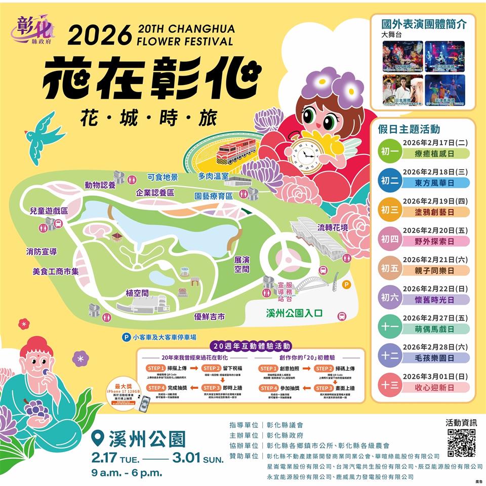 新聞焦點 「2026花在彰化」盛大開幕!邀你走進在花城展開的時光之旅 發布日期 2026/02/17~2026/03/17 | 發佈單位: 農業處 | 發佈日期: 行銷企劃科陳科長 7531661 | 更新日期 2026/02/17 | 瀏覽人數: 75人 《置頂》 「2026花在彰化」於今(17)日在溪州公園盛大開幕,由彰化縣長王惠美親自主持。活動持續到3月1日,共13天,每日上午9時至下午6時免費入園,帶領大家走入「花城時旅」的夢幻世界。王縣長表示,「花在彰化」原本是為行銷田尾及永靖等花草苗木的地方活動,20年來一步步走向全台走春第一品牌,帶來龐大觀光效益。本次「花在彰化」主題是「花城時旅」,將20年來的情感、記憶以及對未來的想像融入,成為一場跨越時空的花海盛宴。邀請鄉親一起回娘家,在難忘的旅行中創造更多回憶。 王縣長推薦大家幾個必逛及必拍景點: 首先,20週年的回憶互動牆。民眾可以上傳20年來曾經來過「花在彰化」的照片。照片就會即時呈現在電視牆上面,分享美好回憶,可以列印專屬紀念照。完成照片分享,還有機會抽中iPhone 17及多項農特產品。 其次,3大主題展區,主題館「流轉花境」透過繽紛花藝設計,引領大家回顧20年來的時光。從「花啟時分」走到「花漾未來式」;從農業生產到工業化發展;一直到永續再生,透過數位互動投影,用花卉串起土地、產業以及人的情感。小展館「植空間」則將花卉帶到生活場景,展現花卉多元運用,館內有食農教育及園藝手作DIY。並設置開放式多肉溫室,裝扮許多仙人掌跟多肉植物,整個空間彷彿充滿生命的可愛花園。另外,特別為上班族、長青族新增「園藝療育區」,讓民眾在綠意中放鬆、舒緩壓力,感受久違的舒暢。 最後,假日有9大假日主題活動,每個假日都有不同主題。今天是「療癒植感日」,後續還有「親子日」、「塗鴉日」、「探索日」與「寵物日」等等,並邀請來自巴西、摩納哥、日本,還有菲律賓的國際團隊演出,讓鄉親能夠欣賞到不同國家的藝術文化。園區也在「彰化優鮮」農產及「地方美食」市集推出「滿額送」及「兩倍券」等促銷活動,期盼讓民眾買得開心、吃得滿足。 另外,「2026月影燈季」在八卦山同步展出至3月1日,每天晚上5時30分至10時準時開燈,現場有馬戲主題燈、旋轉木馬與燈光秀,並首次推出Rody 與櫻桃小丸子「雙IP」,陪伴大家歡樂過新年。只要完成「花在彰化」、「月影燈季」、「員林燈會」任2個活動集章,還能抽iphone17等多項大獎。誠摯邀請全國鄉親蒞臨彰化看燈、賞花、吃美食,讓美好回憶在難忘的旅行中延續下去。 立委謝衣鳯表示,花在彰化是彰化農業的重要展現,彰化農業已與產業結合,進一步發展成永續產業。期盼未來共同努力,與彰化及台灣的經濟發展持續向前。 議員李俊諭表示,感謝王縣長的用心, 花在彰化發展越來越亮眼。這次20週年「花城時旅」,讓鄉親非常驚嘆。未來只要對地方發展有幫助的政策及建設,議會都會繼續支持。 溪州鄉長江淑芬代表致詞時表示,感謝王縣長多年來用心推動花在彰化,邀請鄉親把握2月17日至3月1日的活動期間,蒞臨彰化賞花走春。 彰化縣農會總幹事呂佩臻表示,誠摯邀請全國鄉親好朋友,蒞臨走春花在彰化。現場準備許多農特產品,希望鄉親來到這裡都能開心買。 農業處表示,感謝所有投入「2026花在彰化」的團隊與認養單位,包含彰化縣不動產建築開發商業同業公會、華暄綠能股份有限公司、星崙電業股份有限公司、台灣汽電共生股份有限公司、辰亞能源股份有限公司、永宜能源股份有限公司、鹿威風力發電股份有限公司、佳和國際事業有限公司、昌祝實業有限公司的大力支持,讓這場盛事得以順利推動。 誠摯邀請全國民眾安排假期蒞臨彰化,白天來溪州公園賞花,晚上到八卦山逛月影燈季,共度充滿花卉藝術與文化魅力的春節時光! 與會貴賓有立法委員謝衣鳯、農業部農糧署中區分署分署長陳尚仁、議員李俊諭、議員劉淑芳服務團隊、議員陳玉姬服務團隊、溪州鄉長江淑芬、二林鎮長蔡詩傑、埤頭鄉長杜懿彩、溪湖鎮民代表會副主席黃佳惠、台北市彰化縣同鄉會理事長謝慶源、彰化縣農會總幹事呂佩臻、農業部臺中區農業改良場場長楊宏瑛、台電彰化區處長王花蘭、機要秘書張建豐、農業處長郭至善、新聞處長李俊德、文化局長張雀芬、計畫處副處長卓智明、各鄉鎮市農會代表、各協會及團體代表、各民意代表及地方仕紳等。 官方活動資訊: 白天賞花:溪州公園-花在彰化 活動期間:115/2/17~115/3/1 9:00~18:00 活動官網:https://www.ch-flower2026.com.tw/ 夜間賞燈:八卦山-月影燈季 點燈期間:114/12/27~115/3/1 17:30~22:00 活動官網:https://ch-rody.mystrikingly.com/