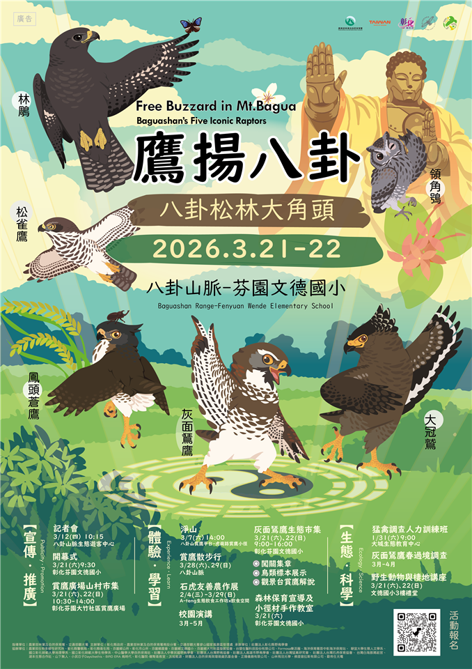 年度活動 【2026 鷹揚八卦】八卦松林大角頭,生態盛典即將起飛! 發布日期 2026/03/16~2026/03/22 | 發佈單位: 農業處林務暨野生動物保護科 | 發佈日期: 顧先生 分機04-7531621 | 更新日期 2026/03/16 | 瀏覽人數: 32人 春分時節,成千上萬的「國慶鳥」灰面鵟鷹正越過八卦山脈北返!今年的「鷹揚八卦」以**「八卦松林大角頭」**為主題,將於 3/21(六)至 3/22(日) 在芬園文德國小熱烈登場。這不僅是一場賞鳥聚會,更是一場融合里山精神、生態教育與森林市集的年度盛事! 🎉 活動亮點: 📍 八卦松林大角頭齊聚:現場專業導覽,帶你一次認識灰面鵟鷹、大冠鷲、鳳頭蒼鷹、松雀鷹及林鵰等猛禽王者。 📍 生態市集:除了文德國小的生態攤位,還有「賞鷹廣場山村市集」,讓你一邊體驗在地特產,一邊仰望鷹姿。 📍 深度體驗學習:首推「闖關集章」活動,搭配鳥類標本展示與森林保育宣導,讓小朋友在玩樂中學會尊重生命。 趁著春光明媚,誠摯邀請全國民眾來到彰化,感受猛禽過境的震撼,體驗最純粹的山林文化。
