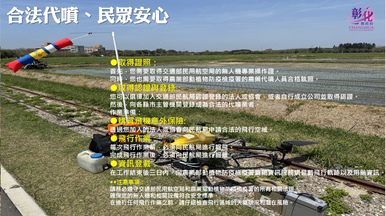 新聞焦點 「合法代噴、大家安心」 縣府持續加強監督與管理農用無人機 以維護農產品品質與安全 歷史訊息 | 發布日期 2025/03/24~2025/04/16 | 發佈單位: 農業處農務暨植物保護科 | 發佈日期: 李先生 04-7531629 | 更新日期 2025/03/13 | 瀏覽人數: 194人 面對農村人口老化與少子化的農業危機,農用無人機已成為農業不可或缺的重要幫手,不僅可以節省人力,還能提升工作效率,同時也可減低農藥對健康的危害。目前正值彰化一期稻作期,為加強防範病蟲害,縣府農業處刻正加強無人機農藥代噴作業現地稽查,農業處強調,無人機農藥噴灑作業雖具備省工高效的優勢,但須嚴格遵守法規,以確保農藥使用安全及飛航安全,縣府將持續加強監督管理,維護農產品品質與環境安全。 要操作農用無人機噴灑農藥或肥料,必須同時通過三個關卡: 一、取得交通部民航局的無人機專業操作證及動植物防疫檢疫署的農藥代噴人員合格執照。 二、法人、協會或公司經交通部民航局的認證登錄,再向各縣市主管機關登錄成為代噴業者。 三、登錄合格後需購買飛機意外保險,再由其加入的法人或協會等向民航局申請合法空域,並於每次飛行作業前後,須向交通部民航局做報飛跟報離的動作,於工作結束後三日之內向農業部動植物防疫檢疫署農藥資訊服務網登載飛行軌跡以及用藥資訊。 在具備上述條件後,農業部動植物防疫檢疫署會製發「合法代噴、大家安心」的識別旗幟,讓農民或飛手在工作時掛在車輛上或工作區域中,以作為是否合法作業的初步識別。業者如果沒有「農藥代噴技術證書」、「無人機專業操作證」,或於飛行噴藥當日上網登錄暨作業結束後3日內上傳施藥紀錄及飛行軌跡,都將視情節,依違反《農藥管理法》或《民用航空法》處1.5萬到30萬元罰鍰。 彰化縣無人機應用發展協會呂政益理事長表示,彰化是農業大縣,但缺少一個合法的遙控無人機術科測驗考場,由於過去在明道大學未退場前,一度即將成功申請設為合格考場,無奈在學校退場後卻不了了之。對此,縣府農業處表示,目前東海大學智慧精緻農業學位學程(埤頭校區)外的有機農場內,已由彰化縣無人機應用發展協會與東海大學合作設立一個無人機飛行訓練示範場地,惟目前考場地點及後續委辦對象必須合法合規,待釐清場地相關使用問題暨商議後續申請作業程序後,將由縣府邀請民航局勘查是否符合做為遙控無人機術科測驗場地,以期能達成交通部民航局「一縣市一考場」的目標,同時也能造福彰化在地青農,協助培訓在地合法專業的無人機操作者。